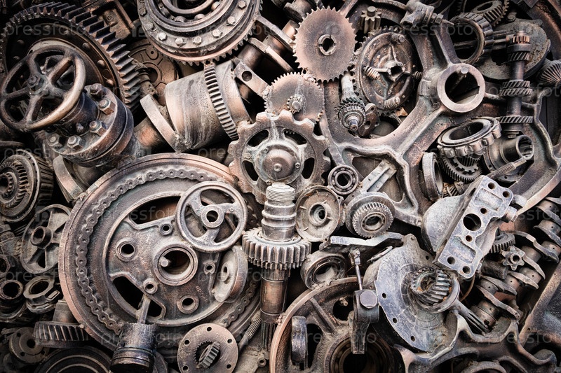 Фон металлических шестеренок. Старые и ржавые запчасти для промышленных машин на свалке