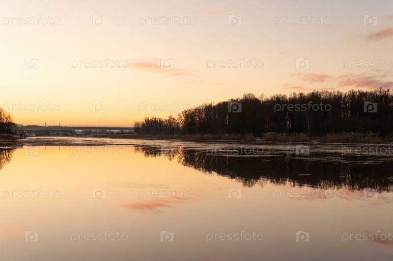 Желто-розовый восход солнца на берегу зимней реки