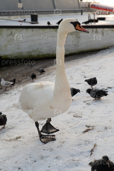 Красноклювый лебедь кормится на набережной реки вместе с голубями