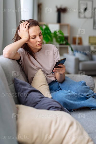 Женщина смотрит на экран смартфона, сидя на диване