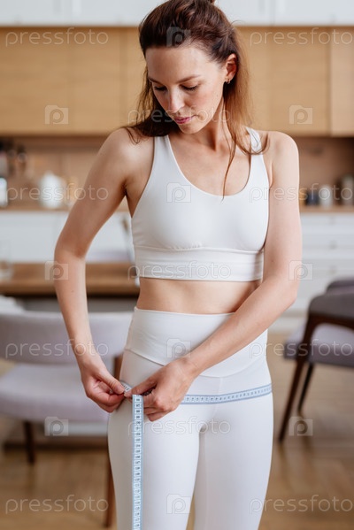 Женщина на кухне измеряет свое тело во время диеты