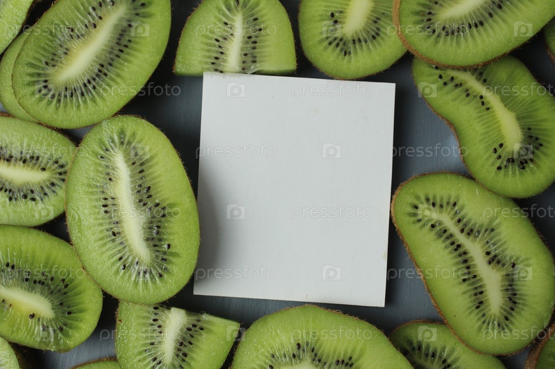 Кусочки макета киви. Белый лист бумаги для записи макета рядом с кусочками зеленого киви. Фон еды киви