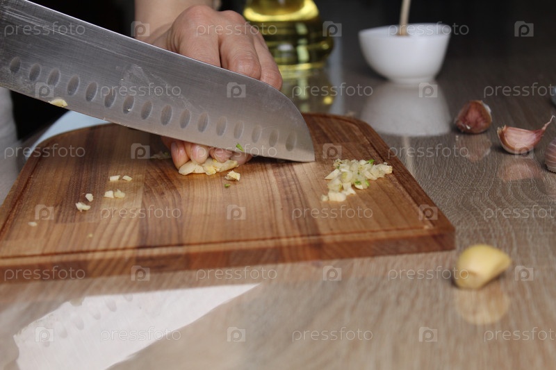 Мелко нарезанный чеснок на разделочной доске крупным планом черного ракурса. Процесс нарезки чеснока. Приправа
