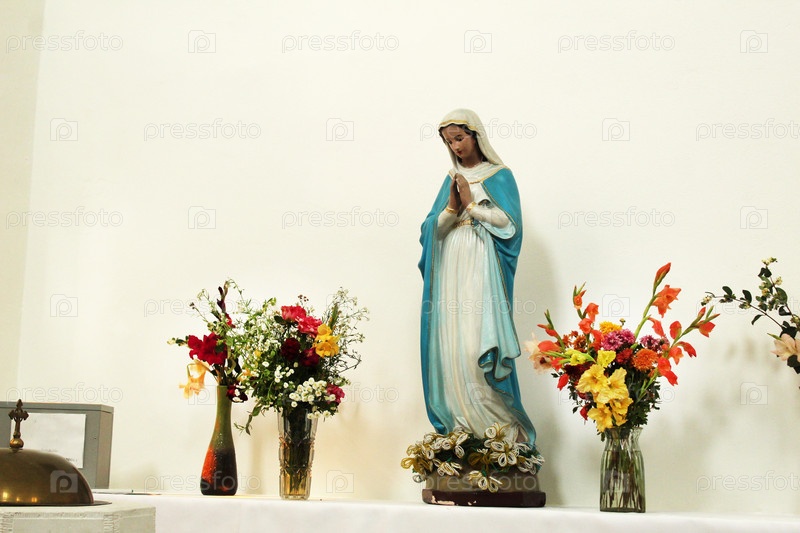 Статуя Девы Марии с цветами в церкви на фоне белой стены. Религиозные символы