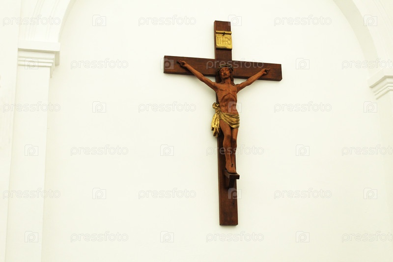 Крест с Распятием в церковном храме. Религиозные символы из дерева крест распятие