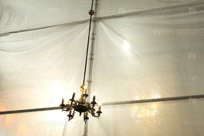 Люстра со свечами. Подвесная лампа со свечами на белом фоне с местом для текста. Старая антикварная лампа