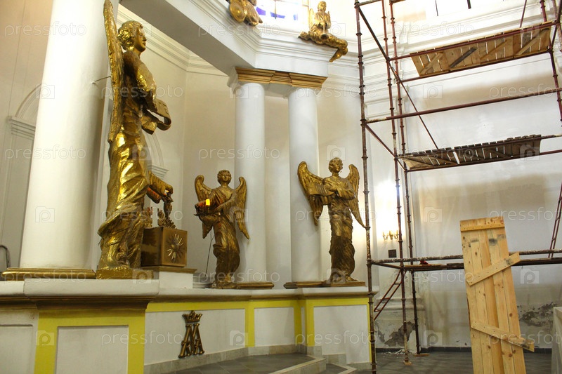 Статуи святых в церкви. Реновация в современном церковном храме. Современная религия