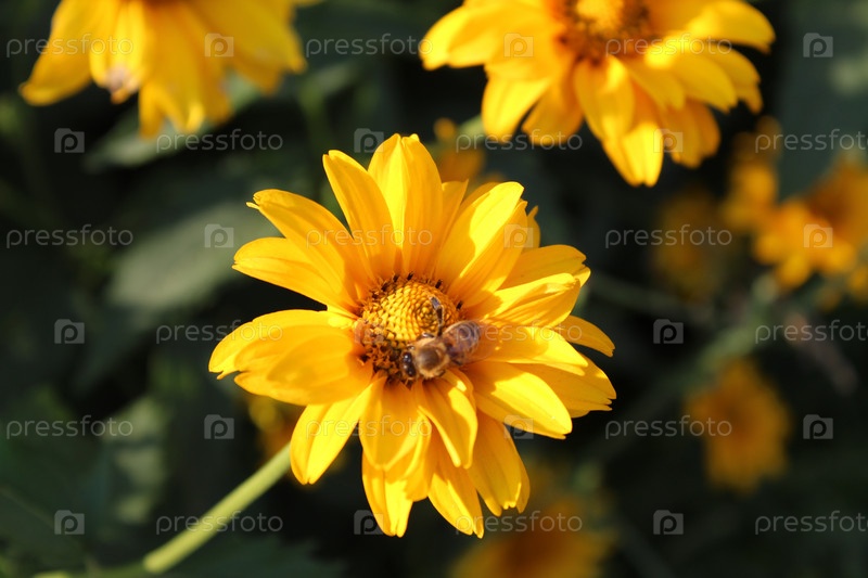 Пчела оса шмель насекомое сидит ест пьет нектар на ярко-желтом маленьком цветке крупный план садоводство цветоводство наука весна лето опыление
