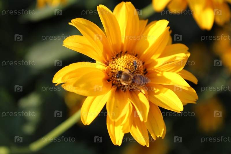 Пчела оса шмель насекомое сидит ест пьет нектар на ярко-желтом маленьком цветке крупный план садоводство цветоводство наука весна лето опыление