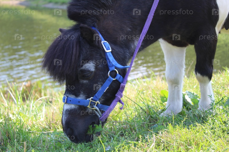 Пони черно-белый ест траву крупным планом вид сбоку. Домашние животные и люди