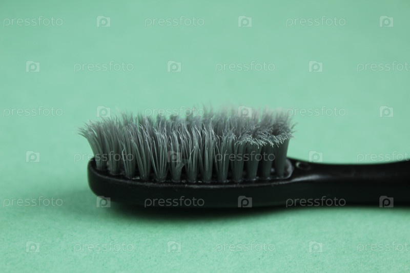 Серо-черная зубная щетка на зеленом фоне крупным планом. Старая зубная щетка