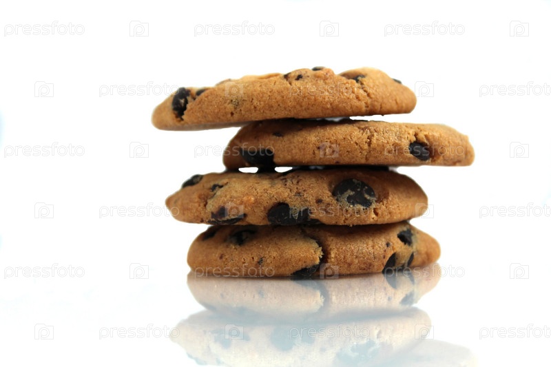 Печенье с шоколадной крошкой, сложенное на белом фоне со свободным местом для текстовых копий