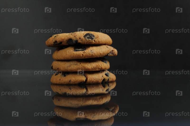 Печенье с шоколадной крошкой на черном фоне с местом для текста. Стопка печенья с шоколадной крошкой