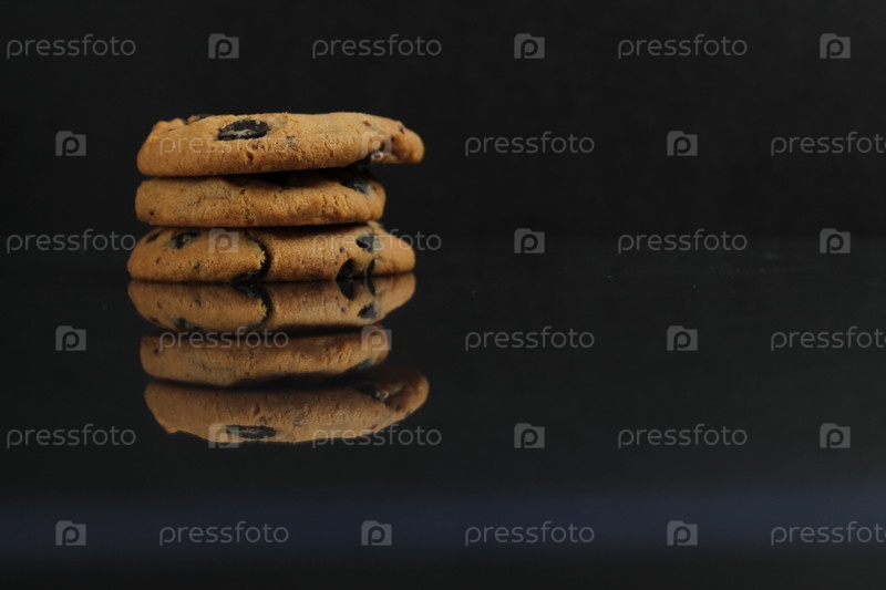 Три печенья отражаются на черном фоне. Оптическая иллюзия с количеством шоколадного печенья