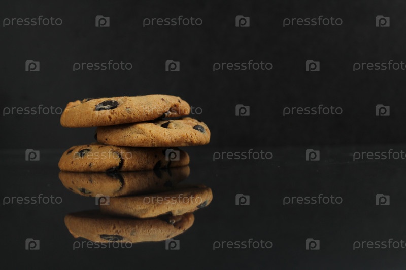 Печенье с шоколадной крошкой, вид боковой стороны со отражением на черном фоне с местом для текста copyspace