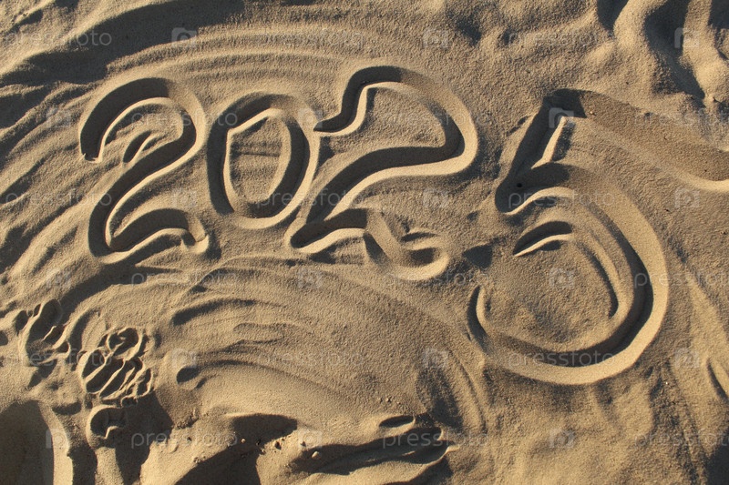 Надпись - число 2025 на песке на берегу моря реки. Новый год Рождество в теплых странах