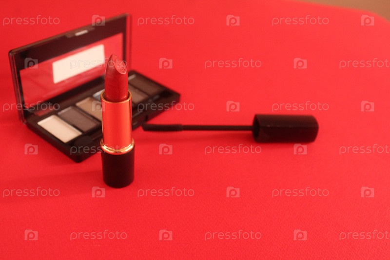 Инструменты для макияжа Помада красная на красном фоне Кисточка для ресниц Тени для век Дневной и вечерний микияж