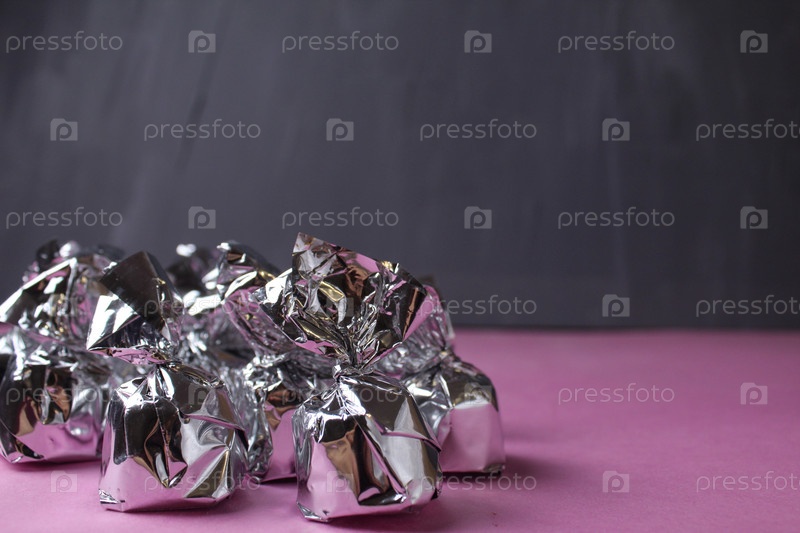 Конфеты в серебряной обертке на розово-сером фоне с местом для текста. Концептуальный фон для кондитерской ручной работы