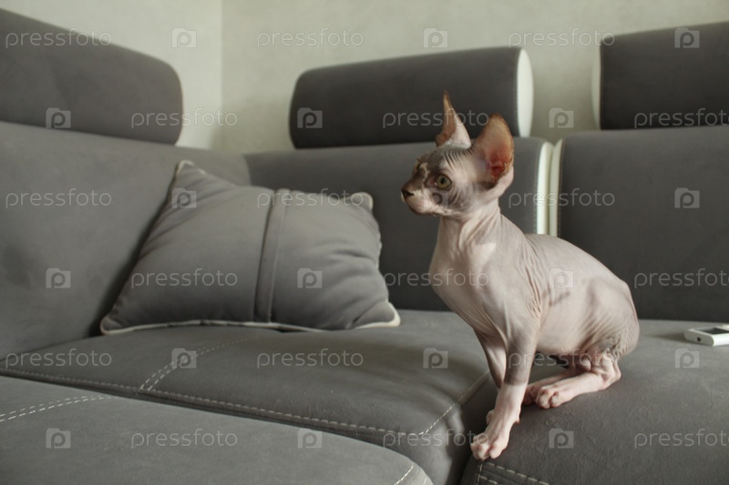 Серый кот сфинкс играет на диване. Домашние животные. Веселье для вашего питомца