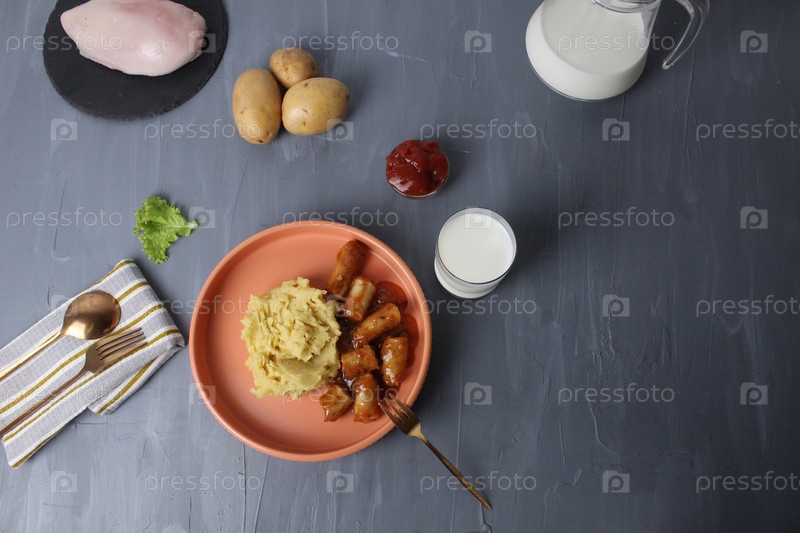 Подача обеда, картофель с сосисками, стакан, кувшин молока, прибой, ложка, вилка, куриная грудка. Концепция домашней кухни