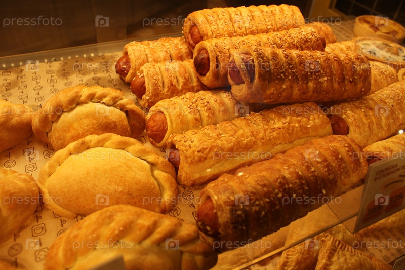 Выпечка в витрине. Крупный план сосисок в тесте и сочников