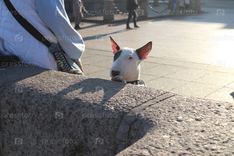 Собака породы бультерьер рядом с хозяйской девушкой на улице. Выгул собак в общественных местах