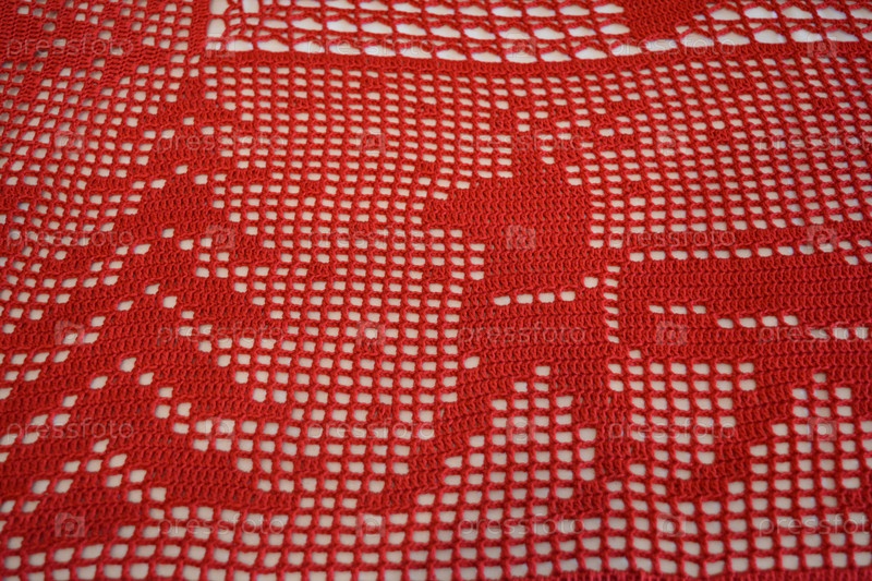 Вязаный крючком фрагмент красной новогодней скатерти