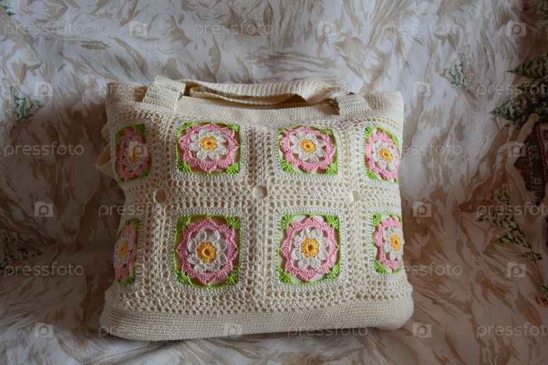 Вязаная крючком сумка молочного цвета с цветными мотивами
