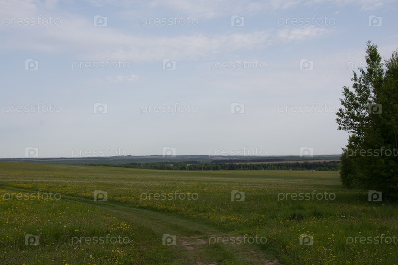 Поле с одуванчиками, голубое небо и лес вдали