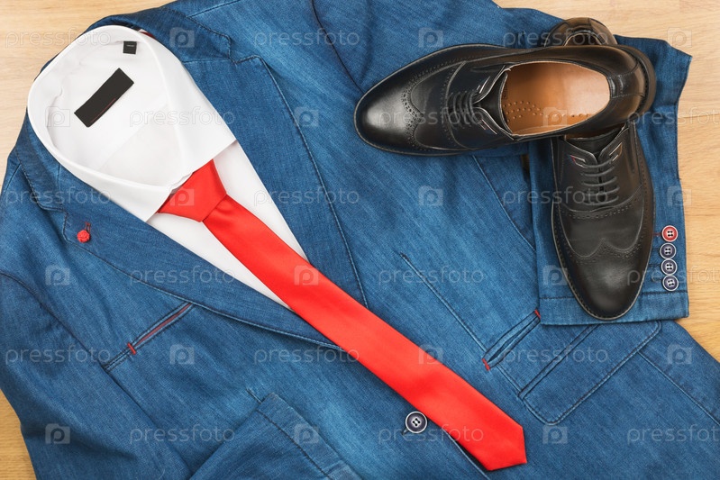 Джинсовая куртка, красный галстук и классические черные туфли, мужская мода
