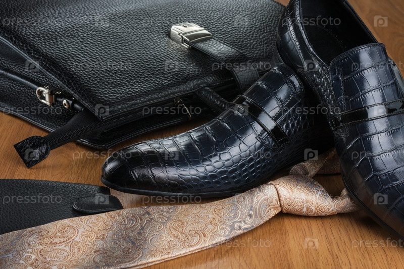 Шикарные классические синие туфли, галстук, кошелек и портфель на деревянном полу