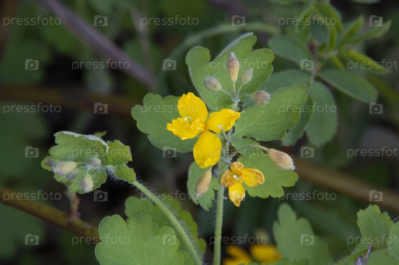 Желтый цветок чистотела на фоне зеленых листьев