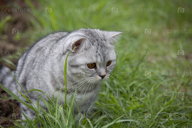 Красивая серая британская кошка с янтарными глазами ищет что-то в траве