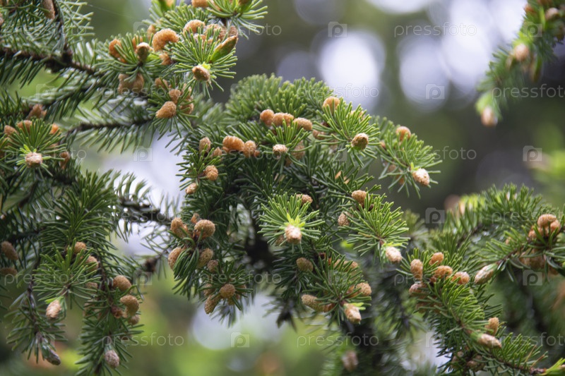 Красивая ветка ели с шишками