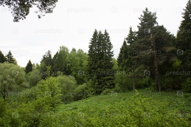Красивый пейзаж. Лиственные и хвойные деревья на фоне светлого голубого неба