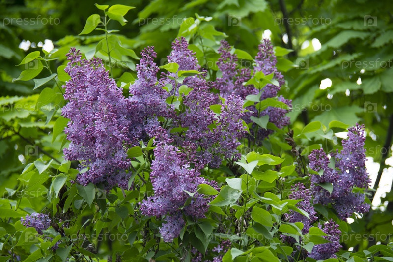 Цветущая сирень на фоне зеленых листьев