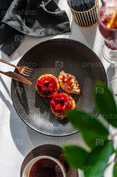 Легкий завтрак в ресторане с кофе и блинами с вишневым джемом