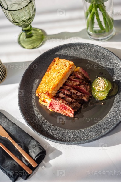 Сытный завтрак с говяжьим стейком, тостами и измельченными огурцами