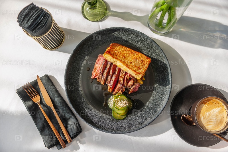 Сытный завтрак с говяжьим стейком, тостами и измельченными огурцами