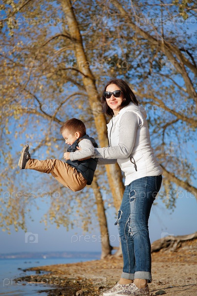 Мама играет с ребенком у кромки воды