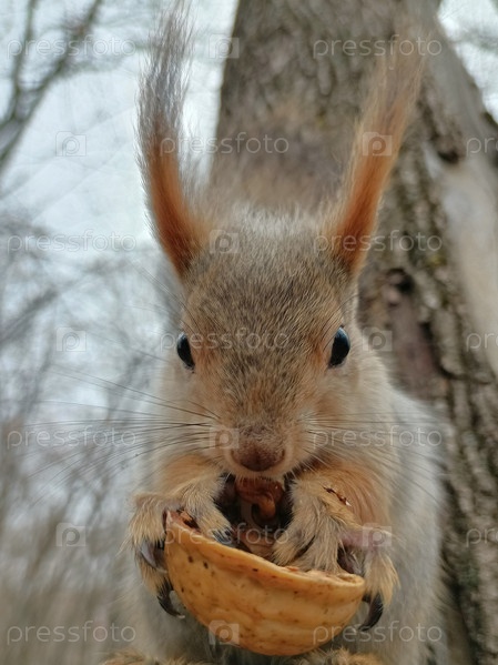 Белка-красавица впечатляюще изящно держит мускулистыми пальцами с острыми когтями орех в скорлупе