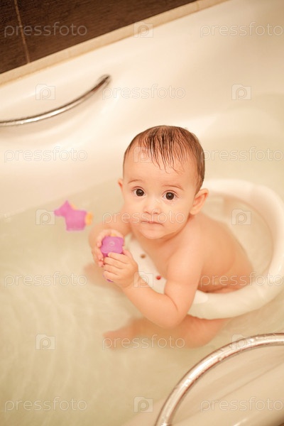 Ребенок играет в ванне с плавающими игрушками