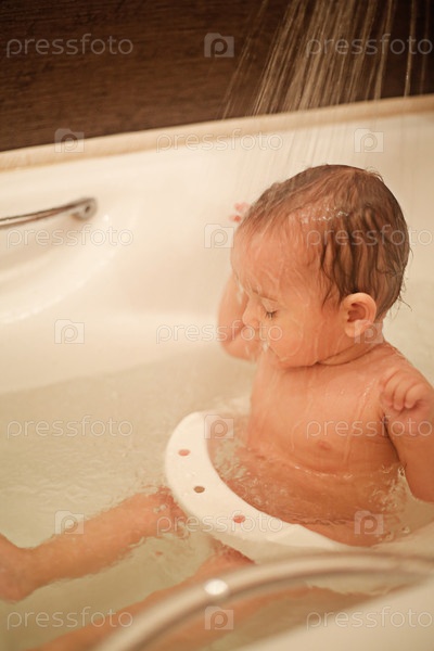 Ребенок плавает, проводя время в безопасном кресле для купания