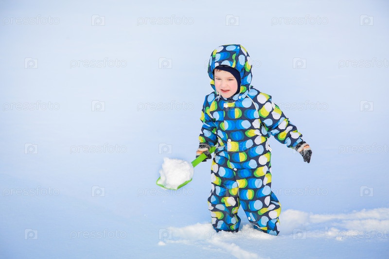 Радостный и веселый ребенок, одетый в яркий зимний наряд, играет на свежевыпавшем снегу