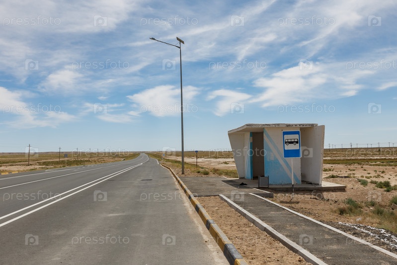 Синяя автобусная остановка и знак автобусной остановки на столбе в степи Казахстана, Мангистауская область
