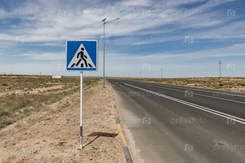 Дорожный знак пешеходный переход в Казахстане. Дорожный знак на обочине дороги в степи