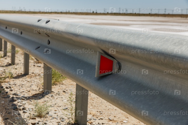 Красные дорожные отражатели вдоль дороги. металлическое дорожное ограждение. Безопасность дорожного движения