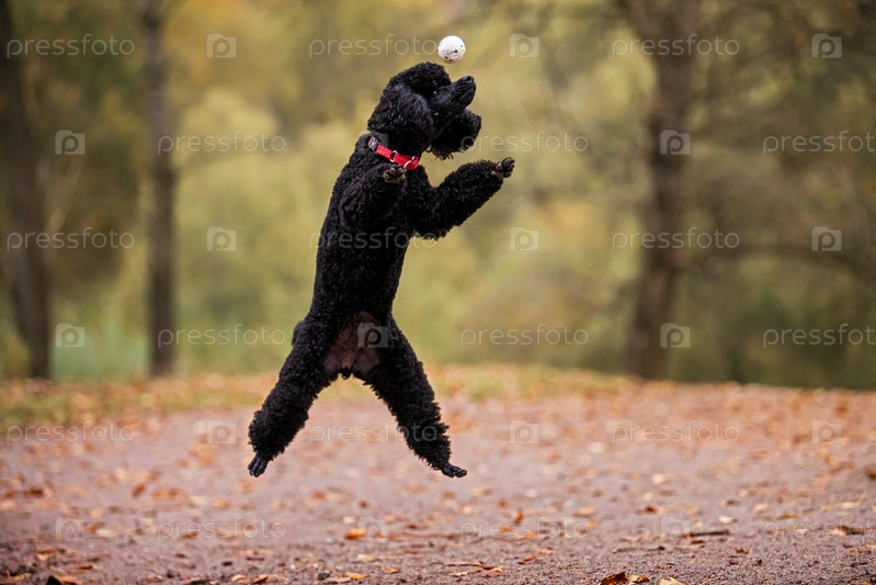 Счастливый пушистый пудель прыгает к мячу в осеннем парке, олицетворяя сущность игры и счастья. Образ жизни