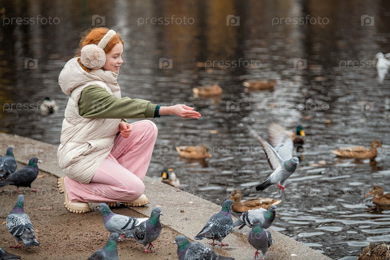 Рыжеволосая девочка кормит голубей и уток, плавающих в пруду, во время прогулки в осеннем городском парке. Тихая, мягкая, пасмурная погода