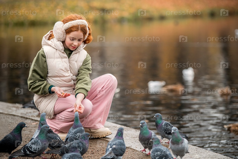 Рыжеволосая девочка кормит голубей и уток, плавающих в пруду, во время прогулки в осеннем городском парке. Тихая, мягкая, пасмурная погода